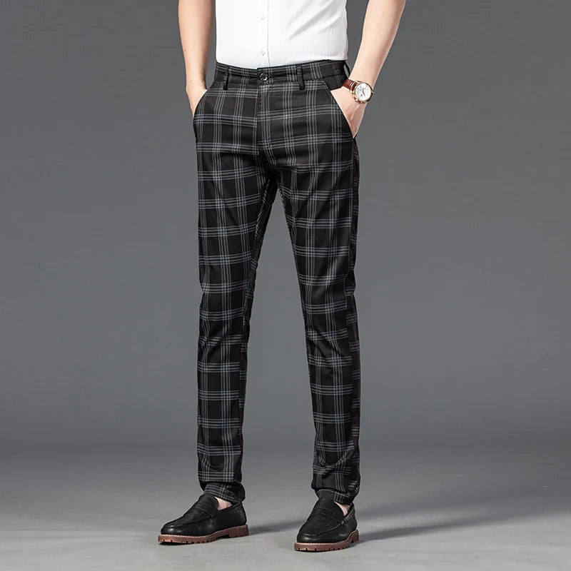 The Vantage Trousers feature a bold plaid pattern woven into a refined slim fit, built for men who move with quiet confidence. Crafted from a flexible stretch fabric that keeps its structure throughout the day, these pants balance sharp styling with lasting comfort.
